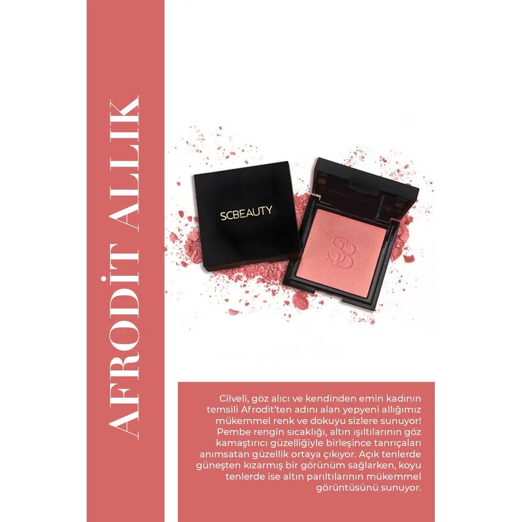 Cilveli, göz alıcı ve kendinden emin kadının temsili Afrodit’ten adını alan yepyeni allığımız mükemmel renk ve dokuyu sizlere sunuyor! Pembenin en güzel tonunu çarpıcı altın ışıltılarla birleştiren Afrodit makyaj dünyasında yerini almaya hazır. Pembe rengin sıcaklığı, altın ışıltılarının göz kamaştırıcı güzelliğiyle birleşince tanrıçaları anımsatan güzellik ortaya çıkıyor. Açık tenlerde güneşten kızarmış bir görünüm sağlarken, koyu tenlerde ise altın parıltılarının mükemmel görüntüsünü sunuyor. Selin Beauty ile Tanrıça Afrodit’in efsanevi güzelliği cildinizde can bulsun… - Yeni Selin Beauty Afrodit Allık lansmana özel sınırlı sayıda üretilmiştir. - Mükemmel pembe tonu ve altın ışıltısı ile her cilt rengine hitap eder. - Açık tenlerde güneşten kızarmış bir görünüm sağlarken, koyu tenlerde ise altın parıltılarının mükemmel görüntüsünü sunar.