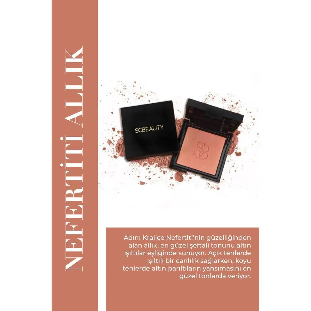 Adını Kraliçe Nefertiti’nin güzelliğinden alan allık, en güzel şeftali tonunu altın ışıltılar eşliğinde sunuyor. Allık dünyasına güçlü bir soluk getirecek olan ürün, en kaliteli malzemeler kullanılarak mükemmel dokuyu yakalamaya çalışırken, eşsiz şeftali tonu ve barındırdığı göz alıcı ışıltılarla kelime anlamı ‘güzel olan’ Nefertiti ismini tam anlamıyla hak ediyor. Açık tenlerde ışıltılı bir canlılık sağlarken, koyu tenlerde altın parıltıların yansımasını en güzel tonlarda veriyor. Selin Beauty ile geçmişin güçlü kraliçesi Nefertiti’nin güzelliği cildinizde can bulsun… - Yeni Selin Beauty Nefertiti Allık lansmana özel sınırlı sayıda üretilmiştir. - Eşsiz şeftali rengi ve altın ışıltısı ile her cilt rengine hitap eder. - Açık tenlerde sağlıklı ve ışıltılı bir parlaklık, koyu tenlere ise altın yansımasının sıcaklığını sunar.
